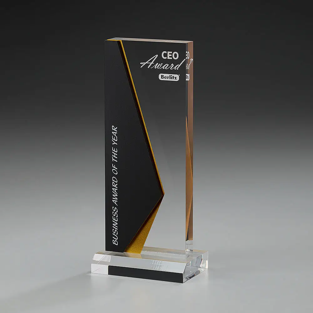 Der Bookmark Award definiert moderne Anerkennung neu. Diese elegante, 3-lagige Acryltrophäe besticht durch einen raffinierten Schichtaufbau, der dem Design eine beeindruckende Tiefe verleiht. Die Basis aus kristallklarem Acrylglas wird durch eine feine Auflage in edlem, aufgedrucktem Goldton ergänzt, welche für eine luxuriöse Aura sorgt. Den krönenden Abschluss bildet eine präzise gefertigte Auflage aus tiefschwarzem Acryl, die einen starken Kontrast setzt und die hochwertige Verarbeitung dieser Auszeichnung unterstreicht.