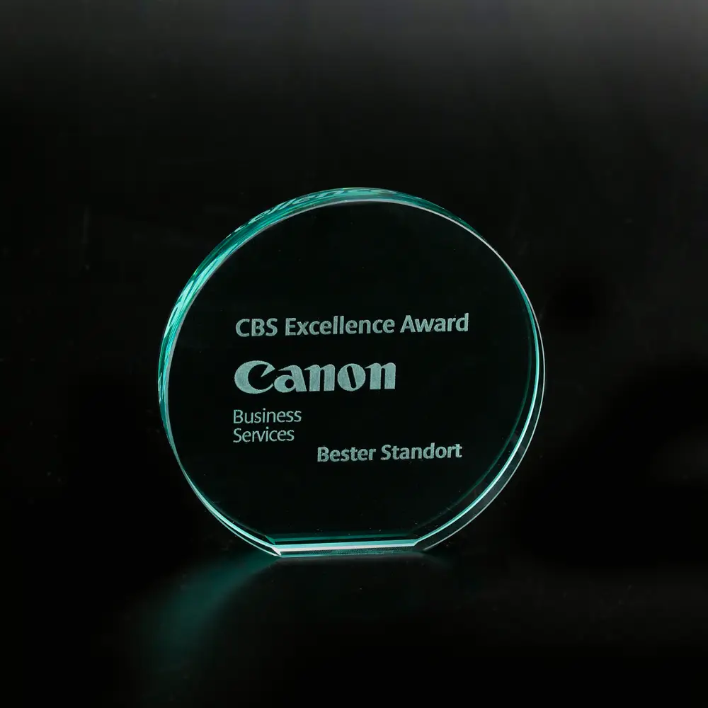 Budget Award Stand Round – Günstig und trotzdem gut -Freistehender Jadeglas-Award im schlchten Design aus 15 mm Jadeglas – Jadeglas-Trophäen mit Lasergravur