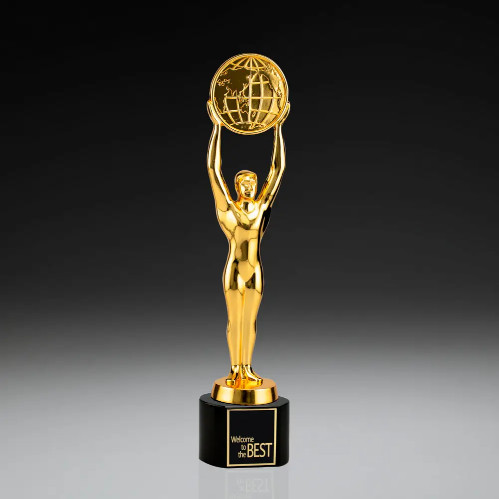 Eine imposante Figur: 275 mm oder 365 mm hoch, aus massivem, schweren Metallguss, hochglanzpoliert und in 18k-Gold-Optik veredelt. In dieser Variante mit einem exclusiven Kristallglas Sockel und dem Weltkarten-Symbol.