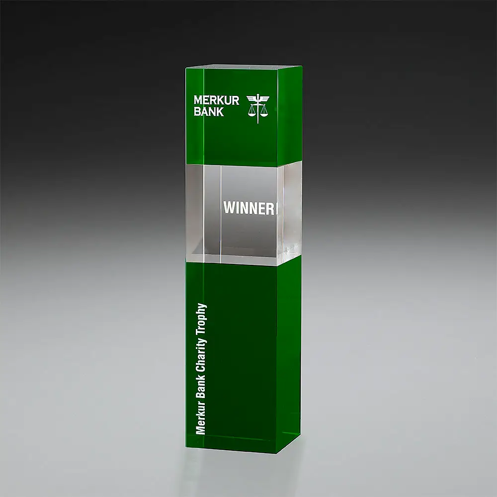 Emerald Cubix – Eine Kombination aus grünem und klarem Kristallglas. Zeitlos elegantdie Glasstele – In Verbindung mit farbigem UV-Druck ein Eye-Catcher!
