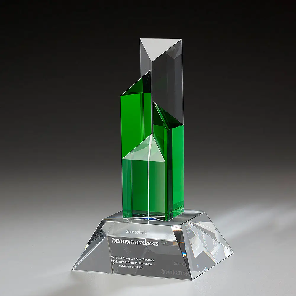 Eine High-End-Trophäe: Abstrakt und dennoch wie ein zusammengewürfeltes Balkendiagramm, aus dreieckigen Glasstäben stellt sich unser Emerald Winfield Award dar. Ist das Angestrebte erreicht, ist der Erfolgsbalken am höchsten. Ein Award, der dieses verkörpert und gleichzeitig doch so vielseitig interpretierbar ist.