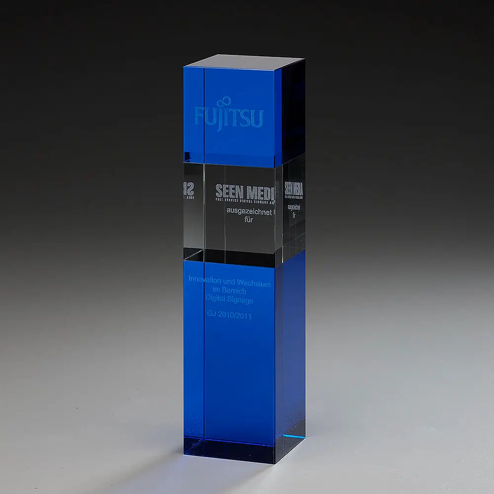 Indigo-Cubix blauer Glaspokal – Eine Kombination aus tiefblauem und klarem Kristallglas in massiver Glasqualität. Zeitlos elegant! Die Beschriftung erfolgt per UV-Direktdruck (blaues Glas) und Lasergravur (klares Glas). Besonders macht diesen Glaspokal eine hochwertige 3D-Innengravur, das Motiv „schwebt“ im Glas.