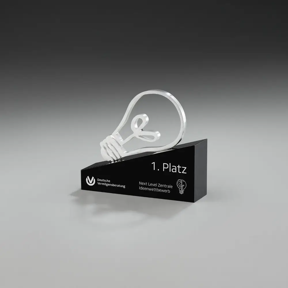 Der Inspiration Award ist eine glanzvolle Hommage an visionäre Genies und all jene, die mit ihren Ideen neue Wege eröffnen. Dieses außergewöhnliche Design kombiniert Kristallglas und Aluminium zu einer beeindruckenden Komposition, die Modernität und Wertigkeit perfekt vereint. Das Glühbirnen‑Motiv aus präzise geschliffenem Aluminium symbolisiert Kreativität, Innovation und Erleuchtung – ein starkes Zeichen für herausragende Leistungen.