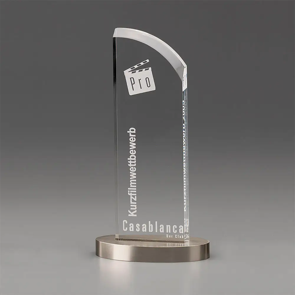 Metal Wing – Die schlichte und klare Eleganz wird dominiert von dem ins Auge fallenden hochwertigen, ovalen und massivem Metallsockel. Dieser Acrylpokal mit Metallsockel vereint moderne Leichtigkeit mit einer beeindruckenden Standfestigkeit und setzt damit neue Maßstäbe in der Welt der Ehrenpreise.