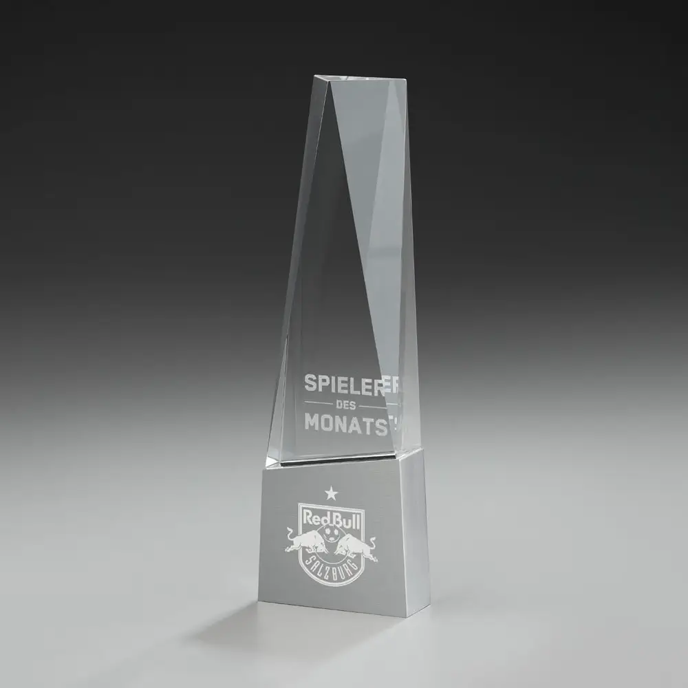 Ein geschliffener Metallsockel aus Aluminium als wuchtiges passendes Fundament für einen anmutigen klaren Kristallglas-Turm.