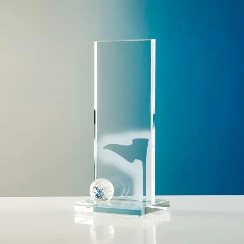 Naomi Golfpokal – Klassischer Stelen-Award aus 10 mm starkem Glas mit massivem Golfball und einer Golffahne in Sandstrahltechnik.