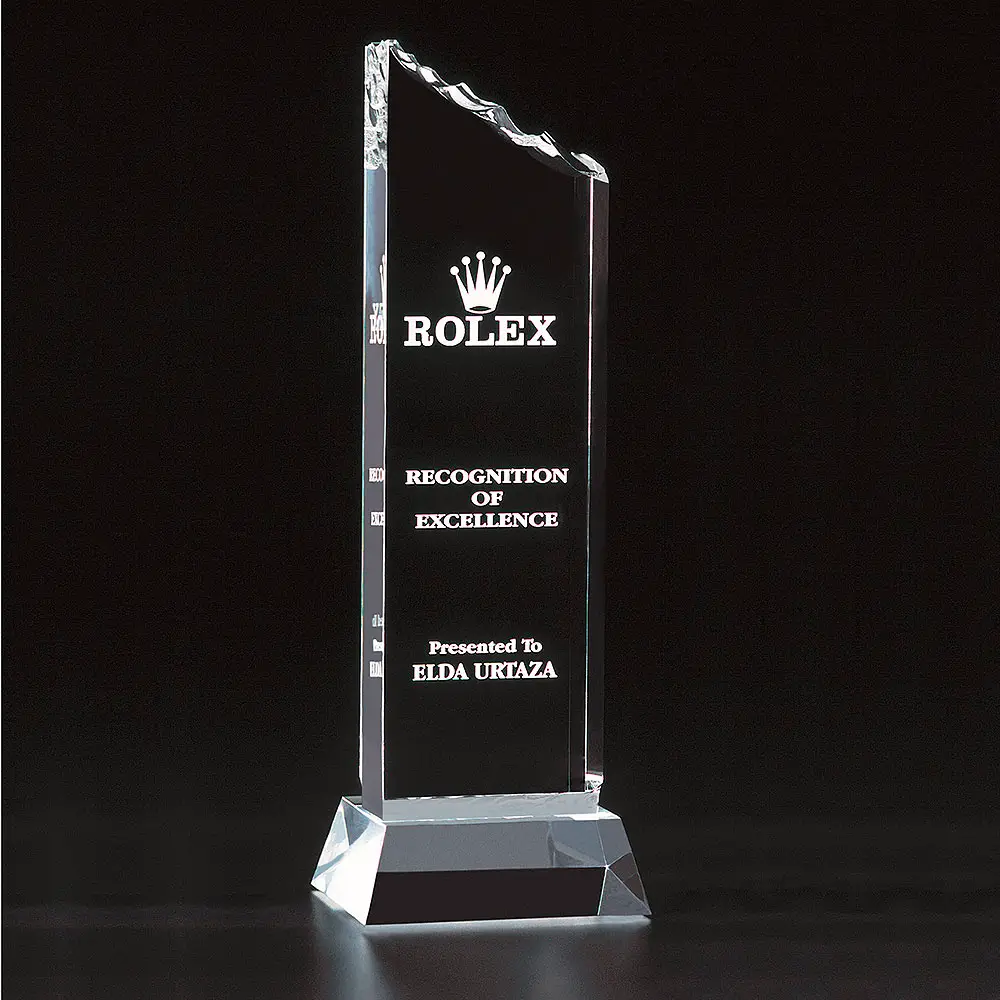 Summit Tower Acrylglas Trophäe – 32 mm dickes Acrylglas, gerade Form mit aufwändiger Dachfräsung, ein toller Acrylglas-Award mit schlichter Eleganz.
