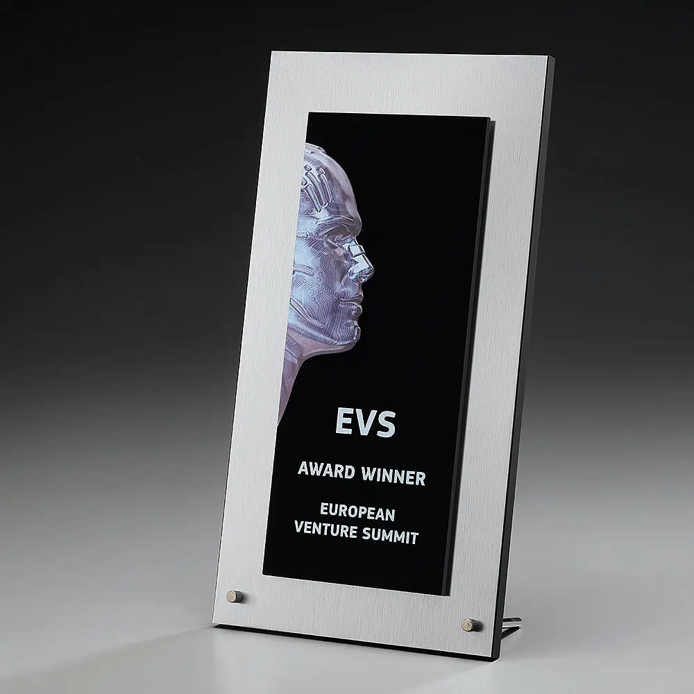 Sunray Chrome Rectangle Award – Schlanke schwarze Acrylplakette 10 mm stark, mit einer Höhe von 345 mm und einer Sunray-Chrome-Metallplatte als Auflage, eine abgesetzte Platte aus schwarzem Acrylglas mit einer Größe von 275 x 115 mm. Moderner Aufsteller in der Kombination von Lasergravur und farbigem UV-Druck ein optischer Leckerbissen – Sunray Chrome Rectangle Zertifikat Award.