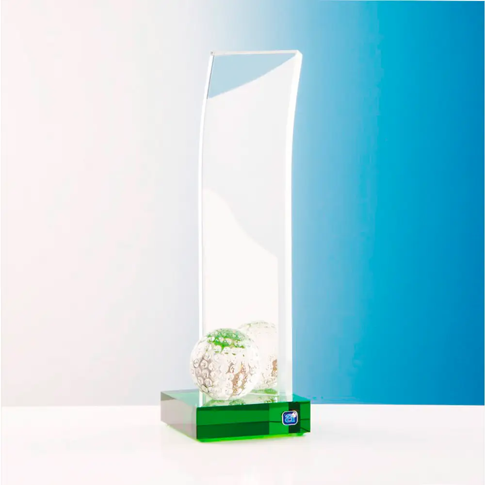 Golfpokal mit einem OptiWhite Glaspylon in 10 Millimeter Stärke und einem massivem Golfball auf einem Grünglas-Sockel, dieser Golf-Award wird mit einer handgefertigten Feinstgravur beschriftet.