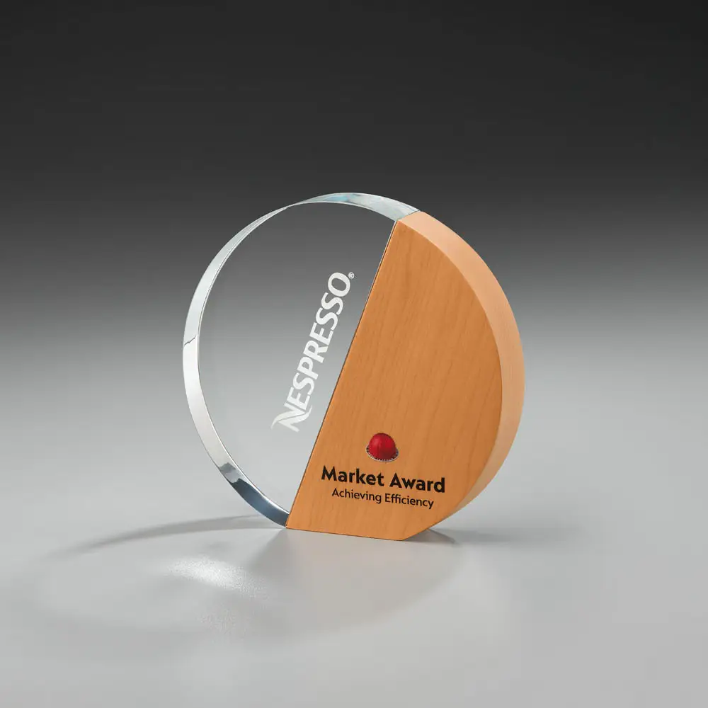 • Holz: Das Glas wird elegant in einen Sockel oder Rahmen aus warmem Holz eingebettet, der die runde Form aufgreift. Diese natürliche Hülle kontrastiert wunderbar mit der Kühle des Glases und verleiht dem Award eine erdige, aber zugleich edle Ausstrahlung.